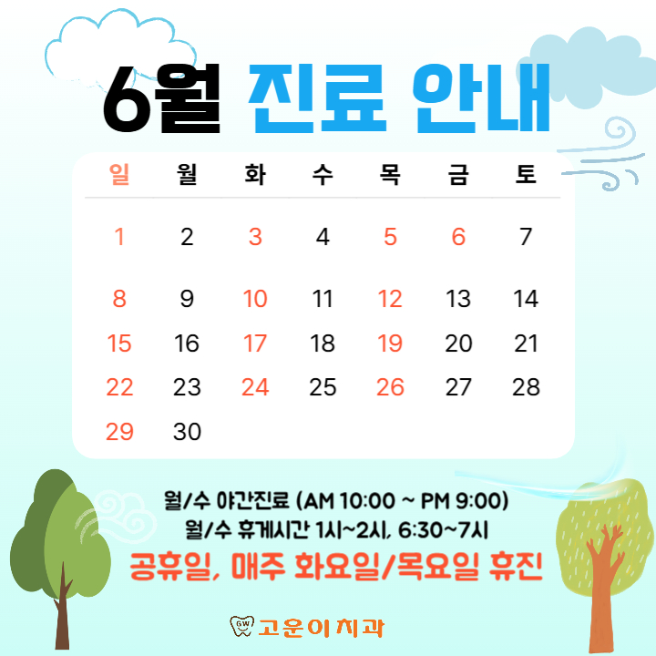 안녕하세요. 고운이치과입니다. 매주 월, 수요일은 야간진료 9시까지